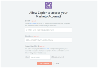 - Here you have to enter your account and find Client ID, Client secret in your Marketo account. Then, click on Yes, continue.