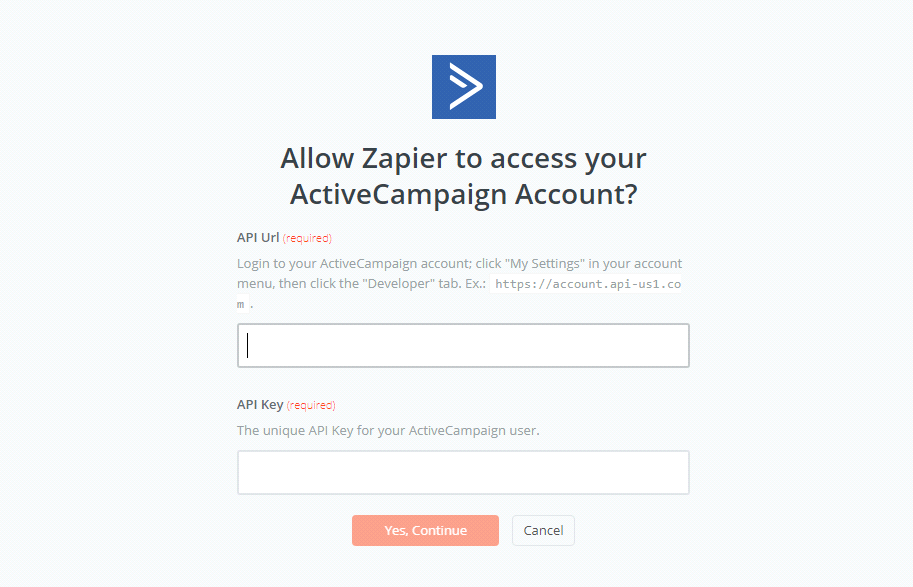 Here you have to login to your ActiveCampaign account. Then, click on My Settings in your account menu and choose developer to find API URL as well as API Key. After you have just entered, your PC will show the account that you have just created. Now, click on Continue.
