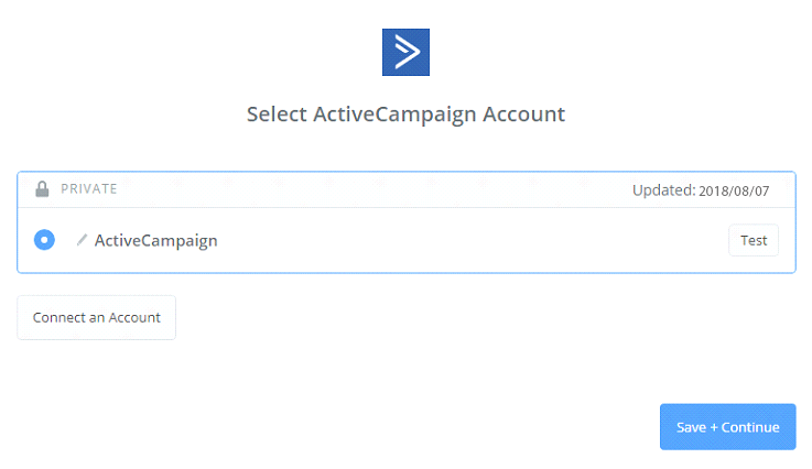 Next, you have to select ActiveCampaign account. Please click on Connect an Account. Then, your screen will display the image below: