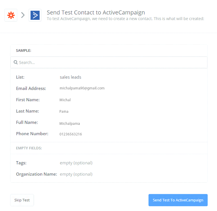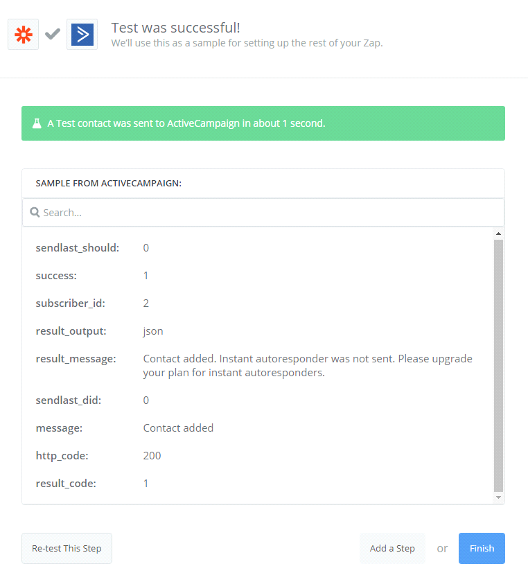 Congratulations, you have tested ActiveCampaign successfully. Now click on Finish and set the name your zap to complete.