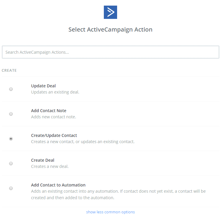Further, you need to choose one of the options in the drop-down list of Select ActiveCampaign Actionfield. After selecting, click on continue.