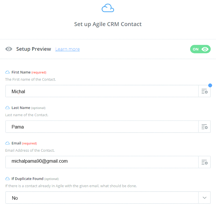 - Next, you have to set up Agile CRM Contact and then enter all required fields on page, choose continue box.