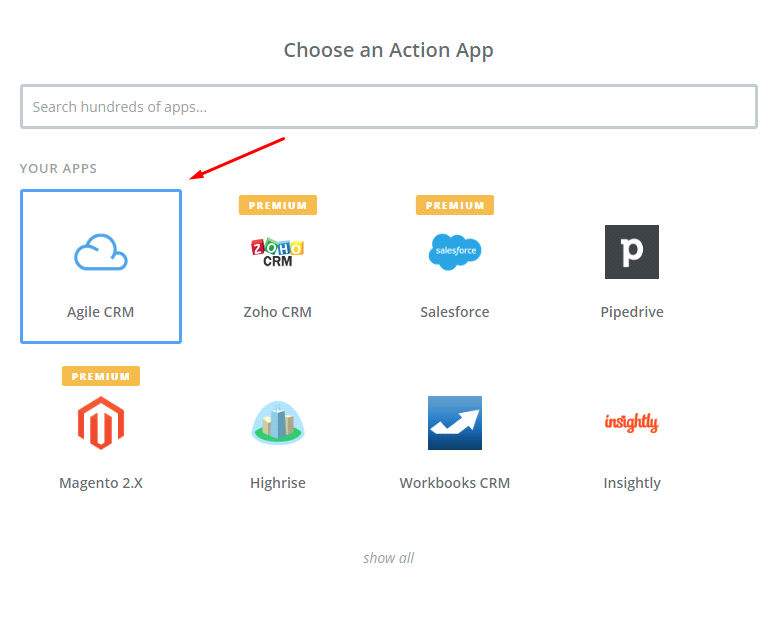 - In Choose an Action App field, choose Agile CRM and then click on Continue.