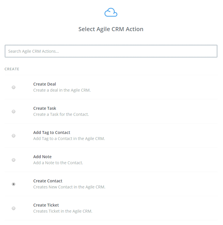 - The next step, you need to choose one of the options in drop-down list of Select Agile CRM Action field. After selecting, click on continue.