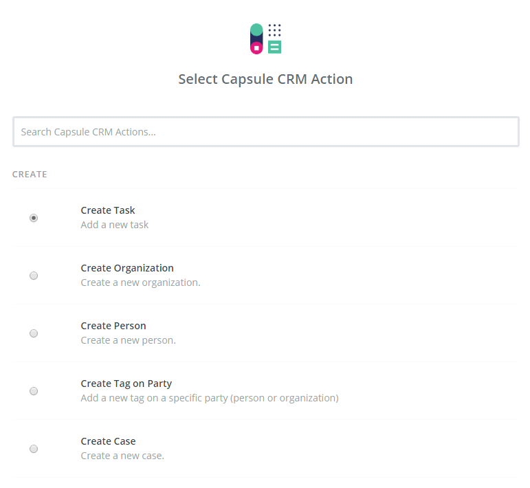 Then, you need to choose one of the options from the drop-down list of Select Capsule CRM Action field. After, making your selection click on continue.