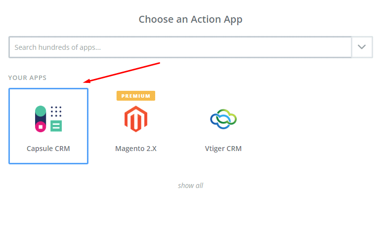 - In Choose an Action App field, select Capsule CRM and then click on Continue.