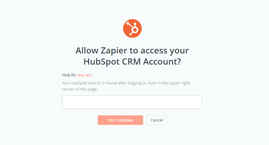 - Now, your screen will display as an image below in which you must enter Hub ID that is found in user information of the HubSpot CRM account, then click on Yes, Continue.