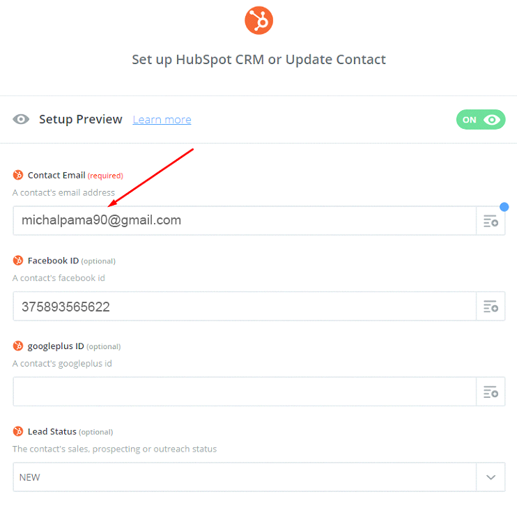- Next, you have to set up HubSpot CRM or Update Contact. Now, enter all required fields on this page, then choose continue box.
