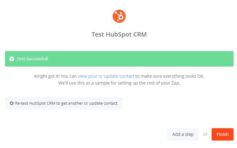 Wonderful, you have tested HubSpot CRM successfully. Finally, choose Finish and set the name your zap to complete.