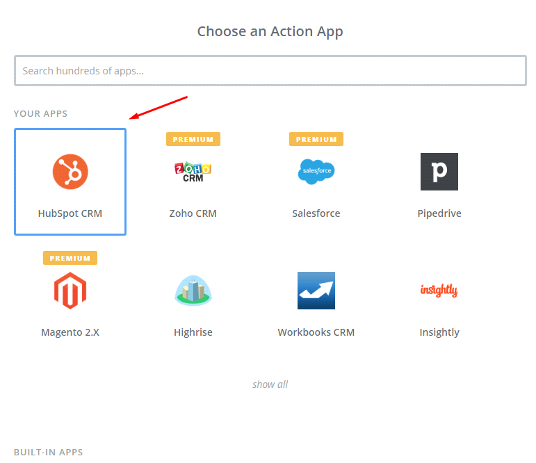 - In Choose an Action App field, choose HubSpot CRM and then click on Continue.