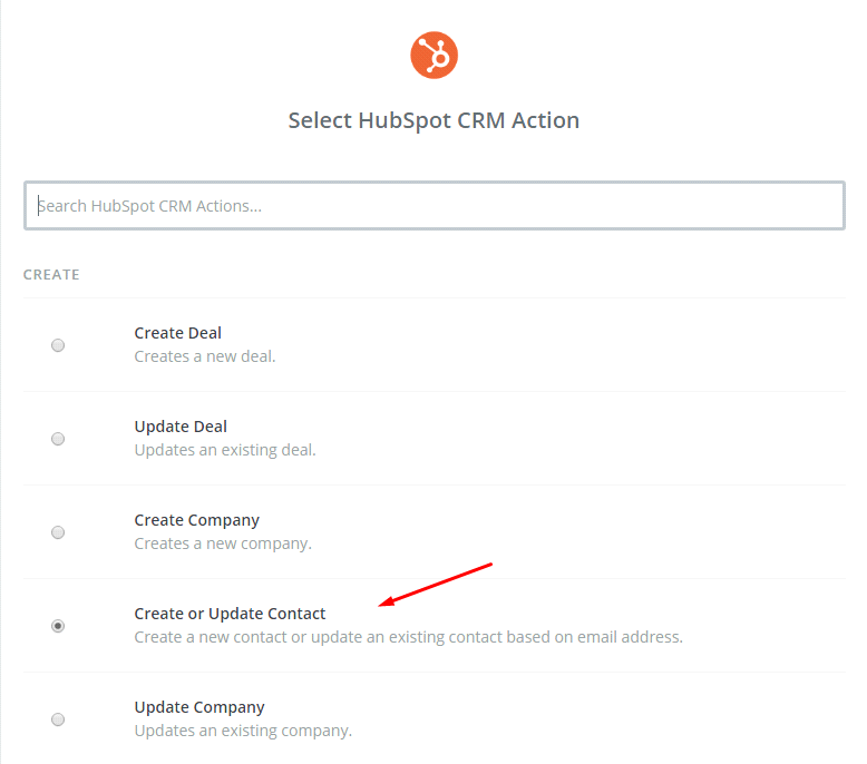 - Then, you need to choose one of the options in drop-down list of Select HubSpot CRM Action field. After selecting, click on continue.