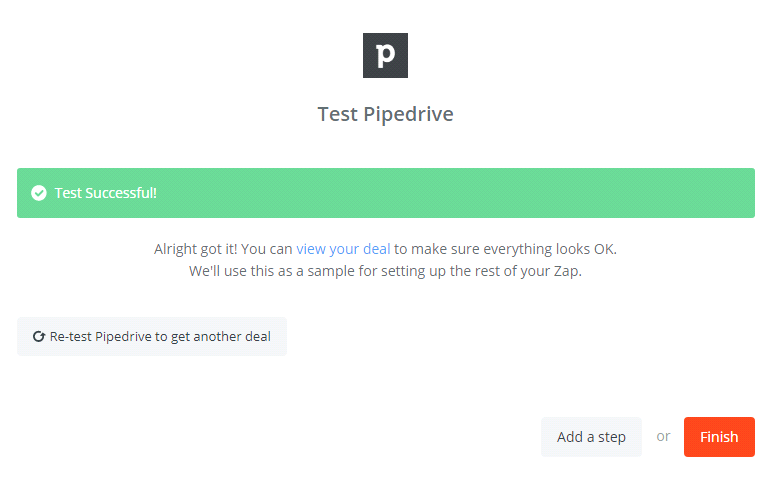 - Now, you have tested Pipedrive successfully. Finally, click on Finish and set the name your zap to complete.