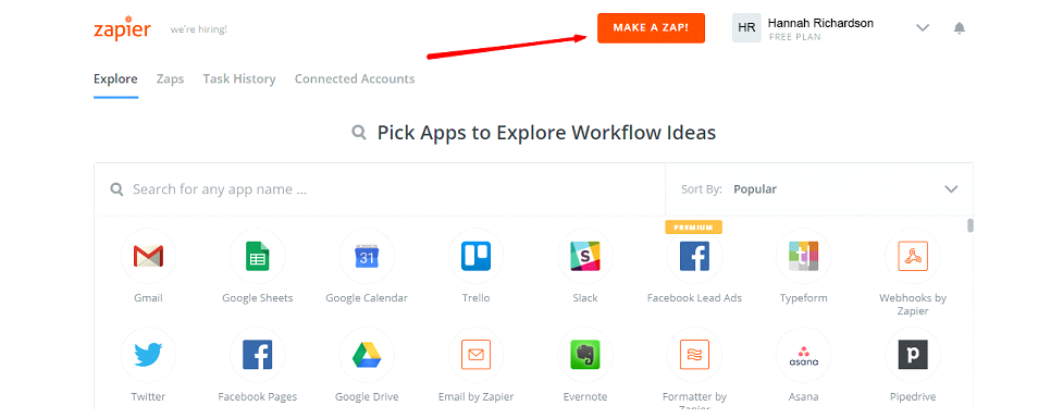 - When you log in into Zapier, choose Make a Zap to start integration.
