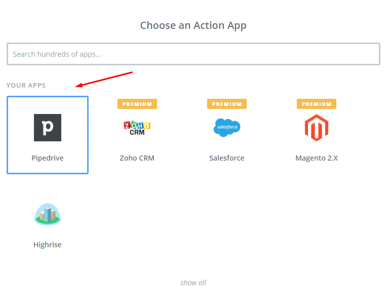 - In Choose an Action App field, select Pipedrive