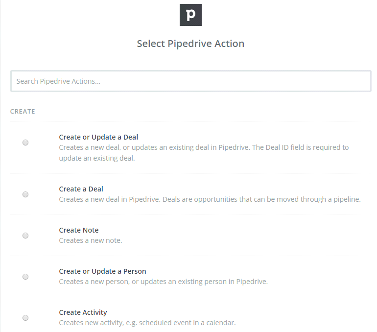 - In Select Pipedrive Action field, you have to choose one of the options that you want to create on the Pipedrive and then click on Continue: