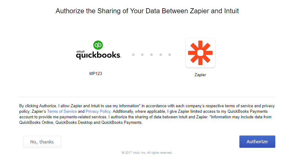 - Click on Yes, Continue box, you will see the confirmation to access your QuickBooks Online account as the following image and click on Authorize button.