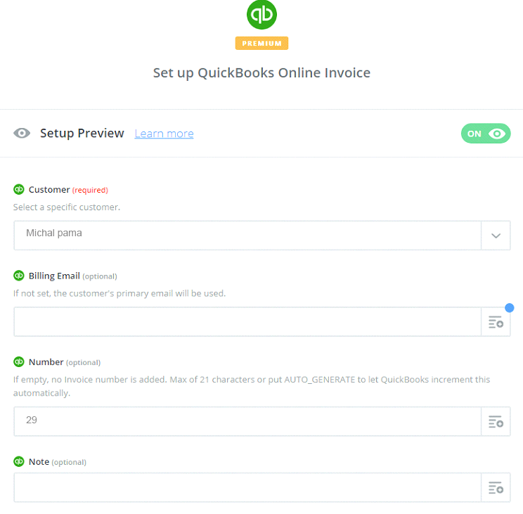 - Next, you have to set up QuickBooks Online Invoice and for that you have to enter all required fields on page, then click on continue box.