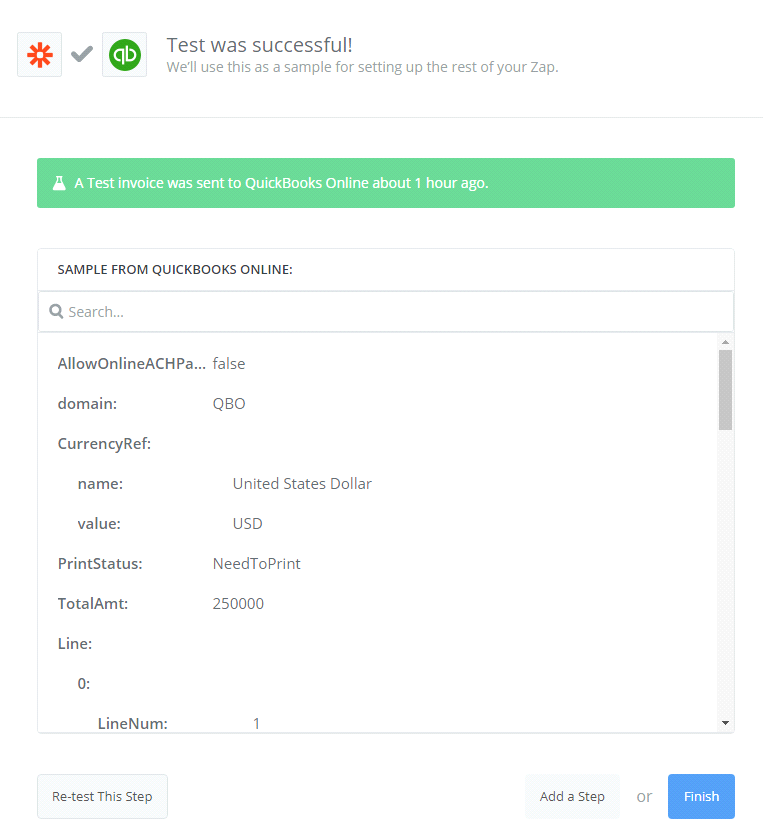 - Wow, you have tested QuickBooks Online successfully. Finally, choose Finish and set the name your zap to complete.