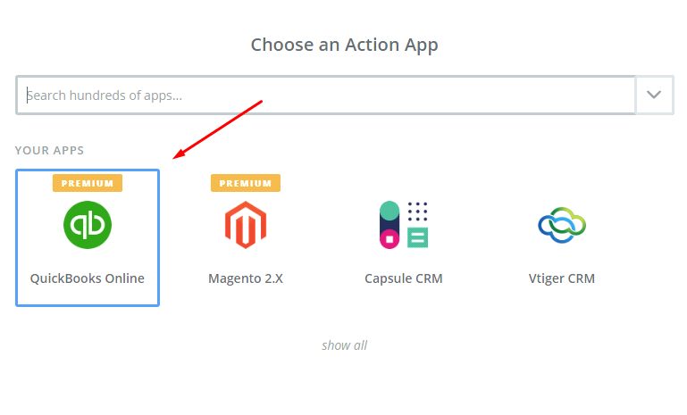 - In Choose an Action App field, choose QuickBooks Online and click on Continue.