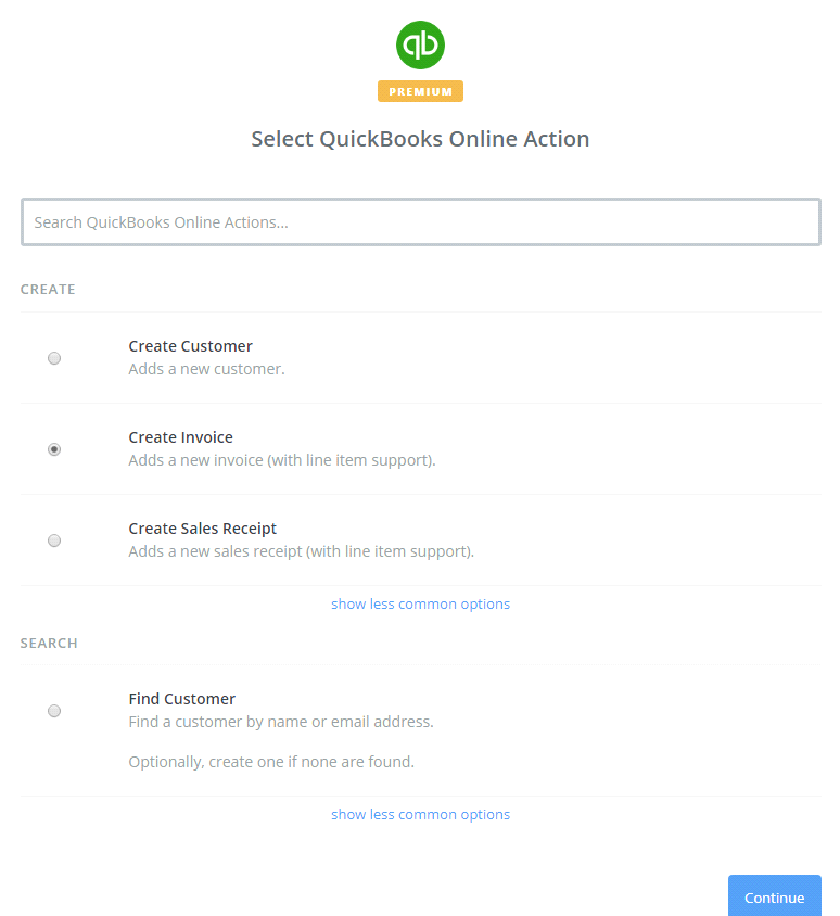 - Then, you need to choose one of the options in drop-down list of Select QuickBooks Online Action field. After choosing, click on continue.