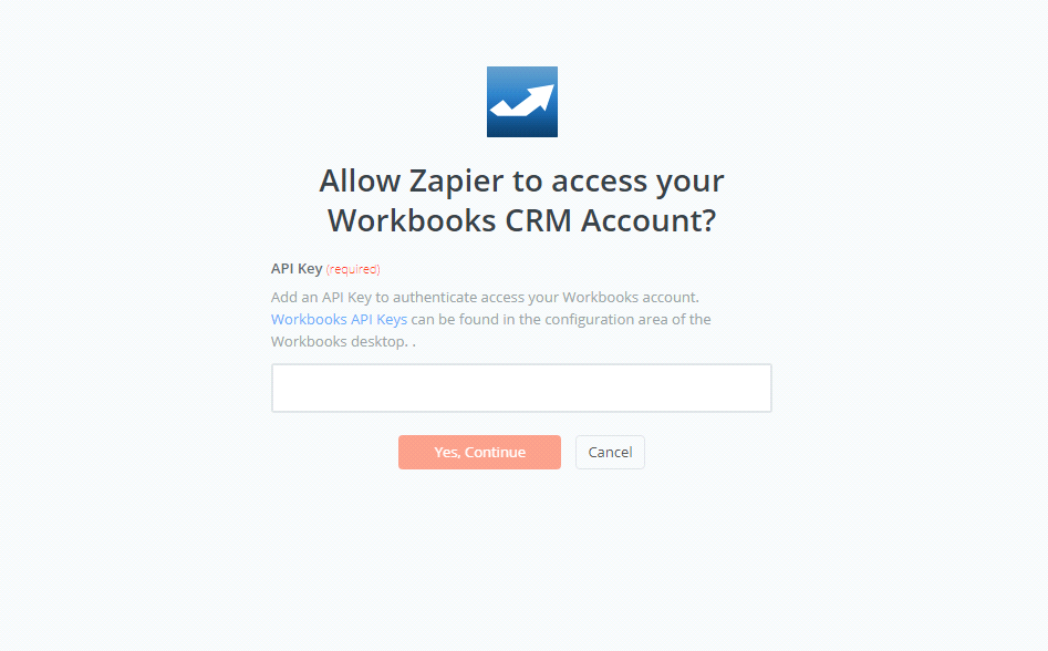 - Your screen will display as an image below, enter your API key from your Workbooks CRM account that you have signed up and click on Yes, Continue