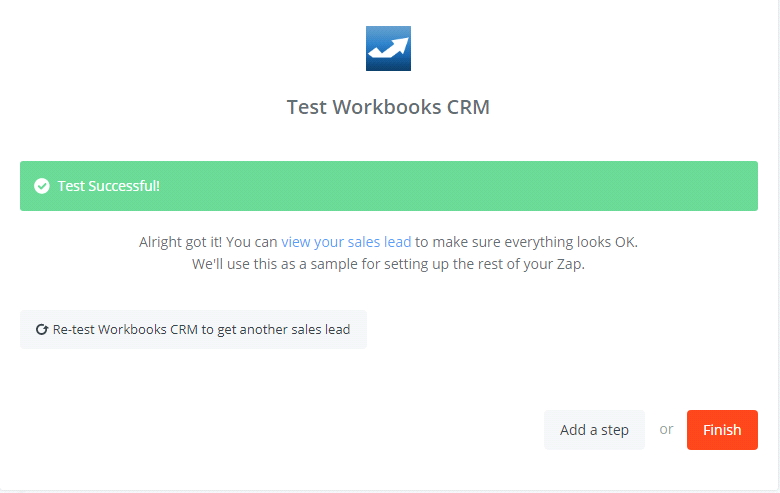 - Wow, you have tested Workbooks CRM successfully. Finally, choose Finish and set the name your zap to complete.