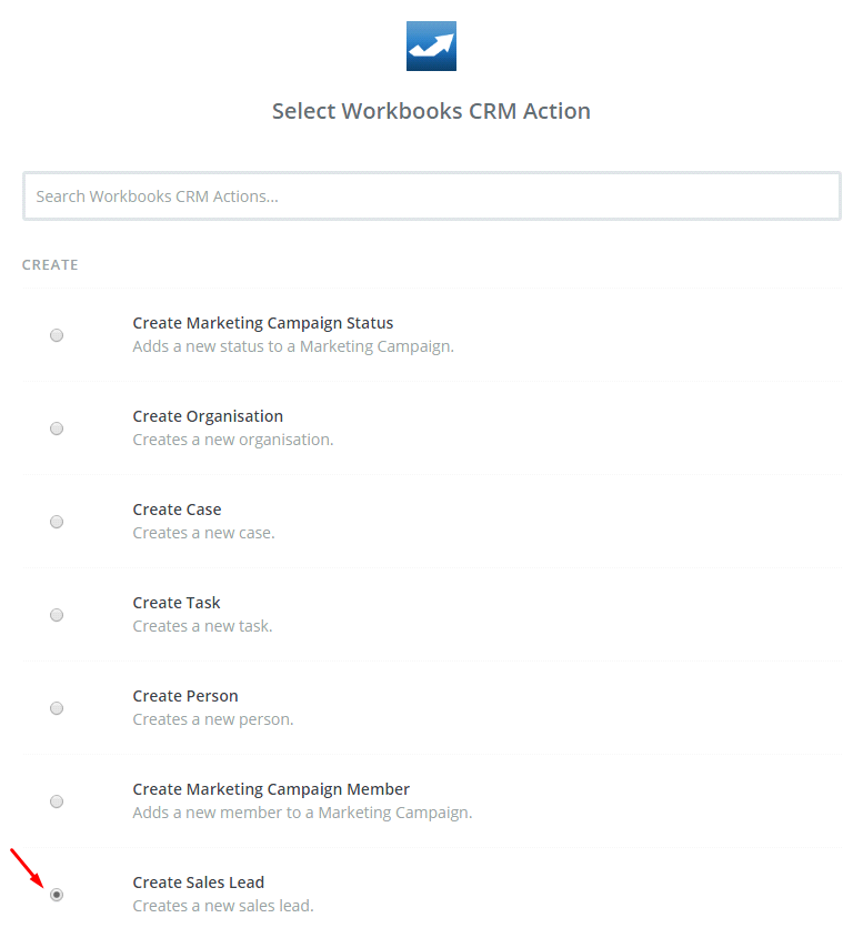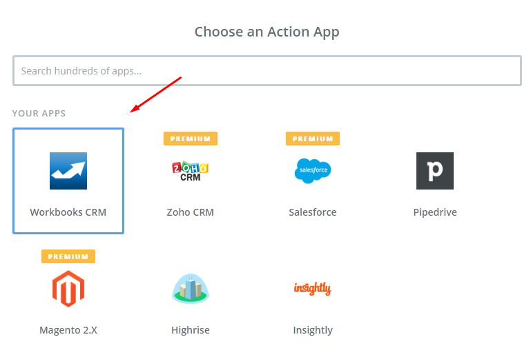 In this step, choose an Action App field, select Workbooks CRM and then click on Continue.