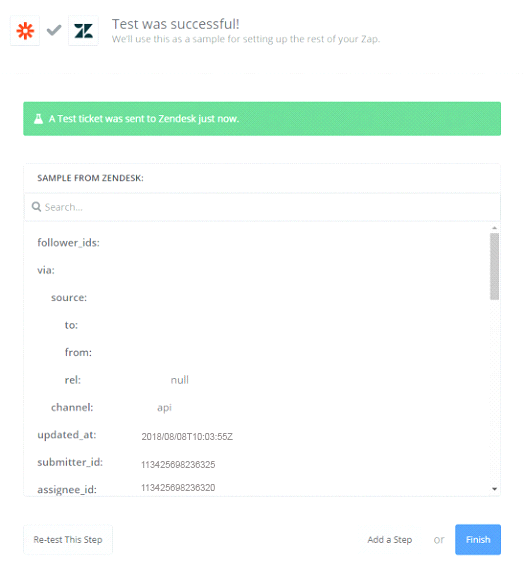 Perfect, you have tested Zendesk successfully. Finally, choose Finish and set the name your zap to complete.