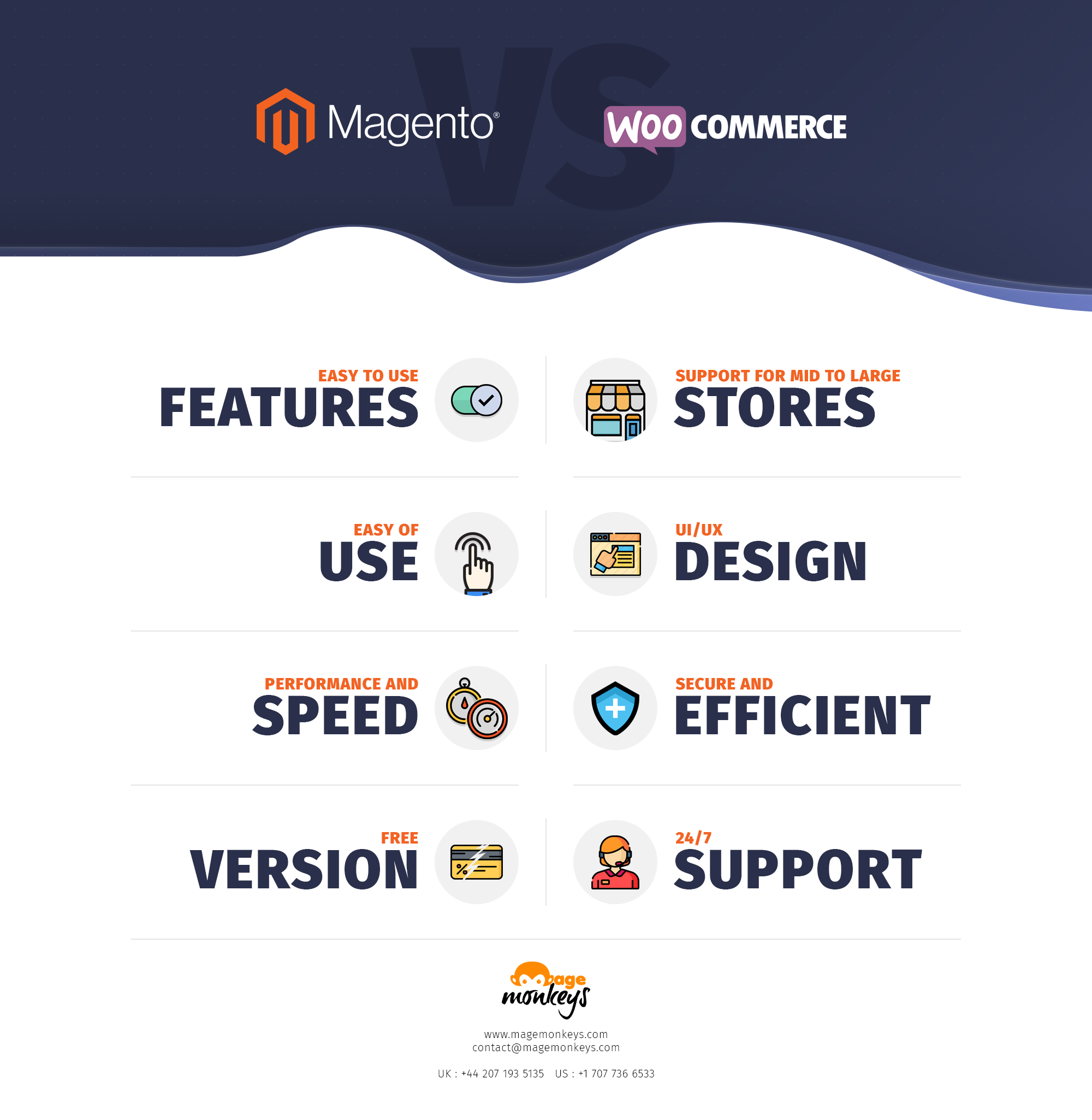 The most important difference is that WooCommerce is an add-on to the content Management system WordPress whereas Magento is a standalone, dedicated E-commerce platform.