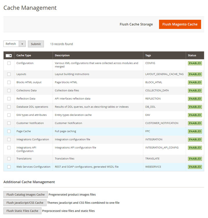 Here, you will find a plenty of caching options to flush your Magento 2 cache.